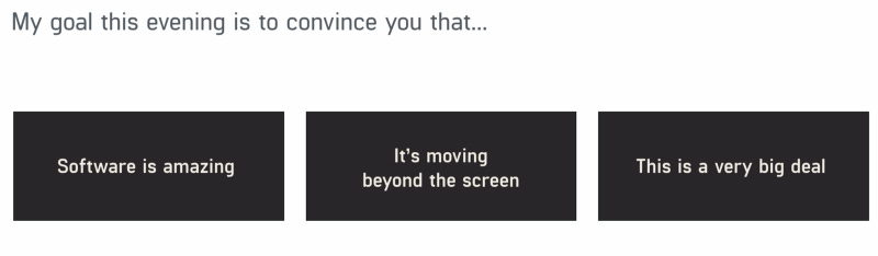 I started my talk with the idea that software shows up in different ways and in different form factors every few years. Software used to look like wires, then big boxes, then CD-ROMs, then apps, etc.