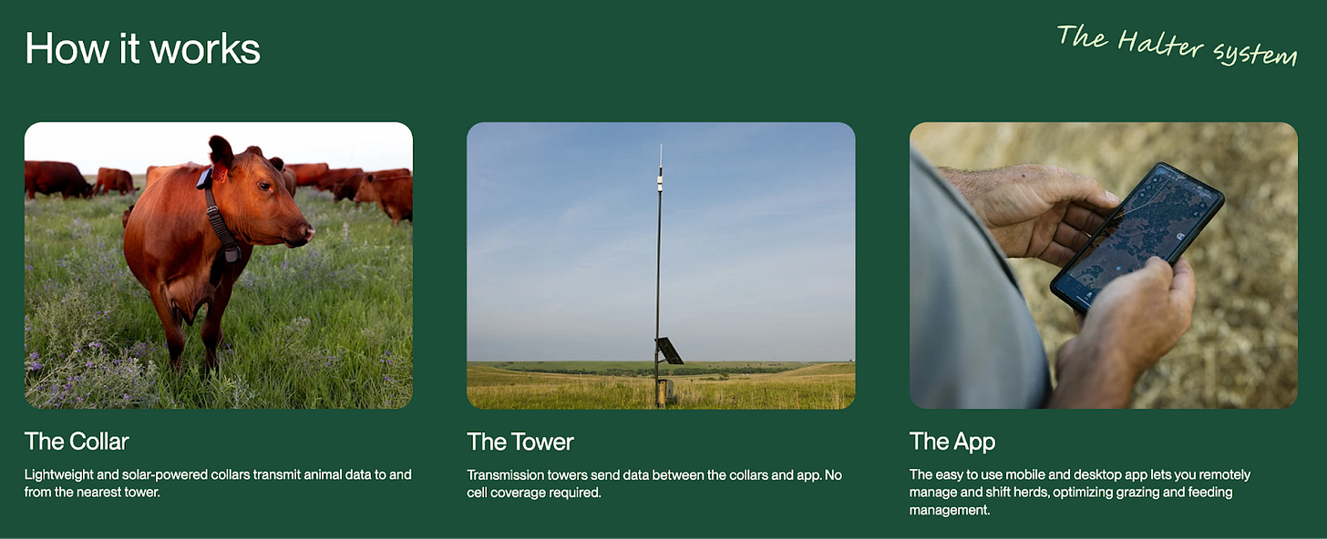 Halter’s platform serves as an operating system to run a dairy farm or cattle ranch. The Halter system starts with 3 components: a smart collar for each cow, towers for connectivity, and an app that lets farmers and ranchers manage their animals and pasture from their phone. Animals are guided by the collar’s sound and vibration cues to enable virtual fencing, digital shepherding, data-driven insights, and a lot more.