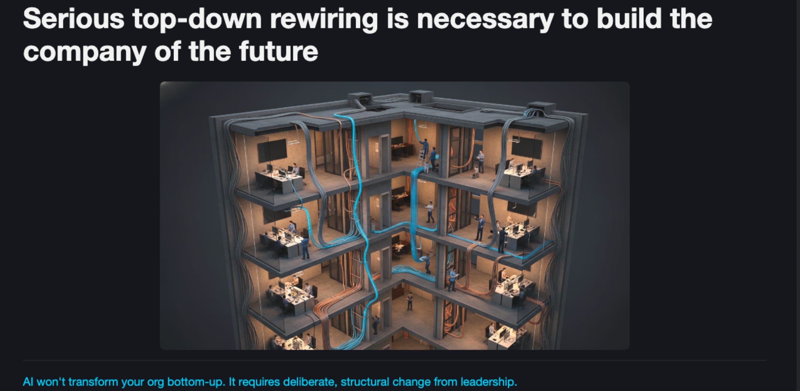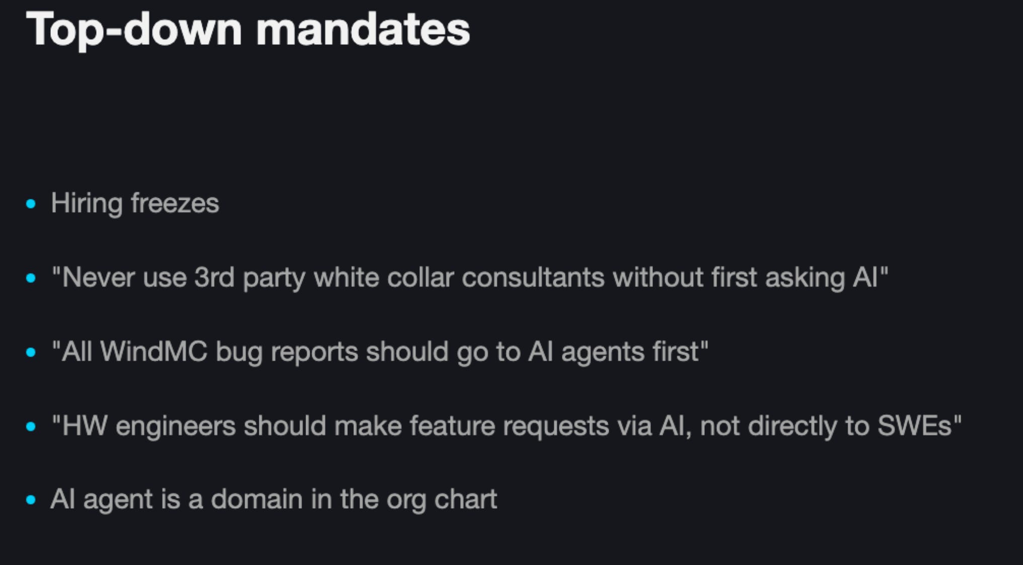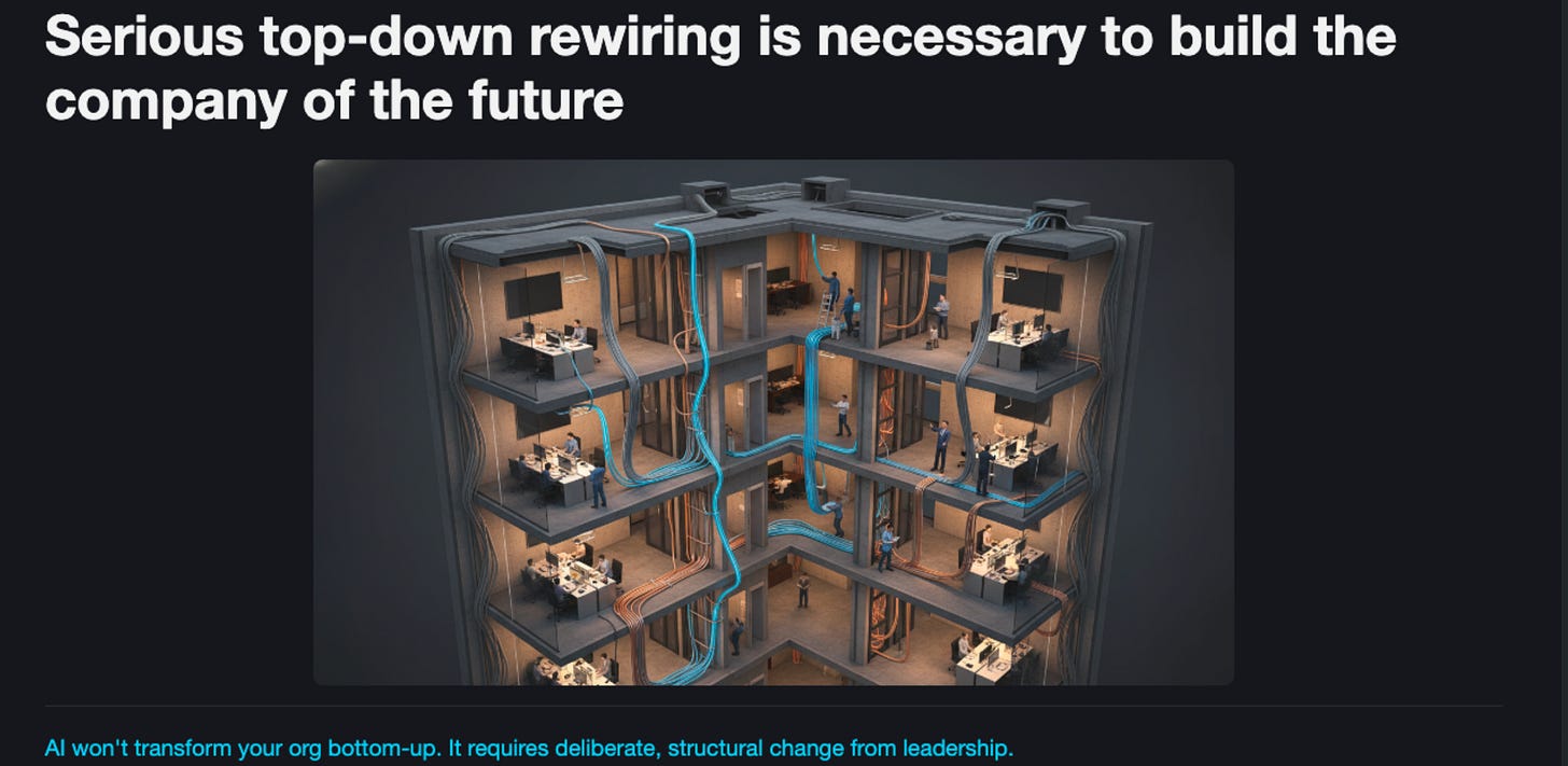 I see plenty of CEOs pounding the table and writing memos about how they demand AI usage. And many of them are good memos. But it’s not helpful to just be demanding: how is everyone in the org supposed to use AI? For some roles, it’s easy, but for others, it’s much harder. Put yourself in the shoes of an employee: this whole revolution is a bit terrifying in the first place, changing how you work is hard, and often it’s unclear how to get the real productivity gains. Making matters worse, even if you you are good at individually using AI, you are bottlenecked by all the human communication in the org, and the AI doesn’t have the tooling to navigate it.