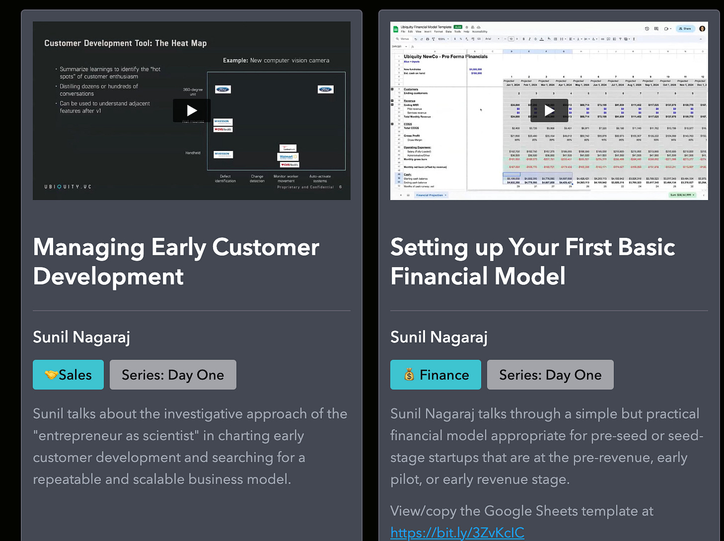 The 6 videos that comprise the Day One Series are for entrepreneurs who are raising or just raised their first round of capital. Topics cover Nailing the Mindset for your First Board Meeting, Setting Up your First Basic Financial Model (including a Google Sheets template you can use), Managing Early Customer Development and more.