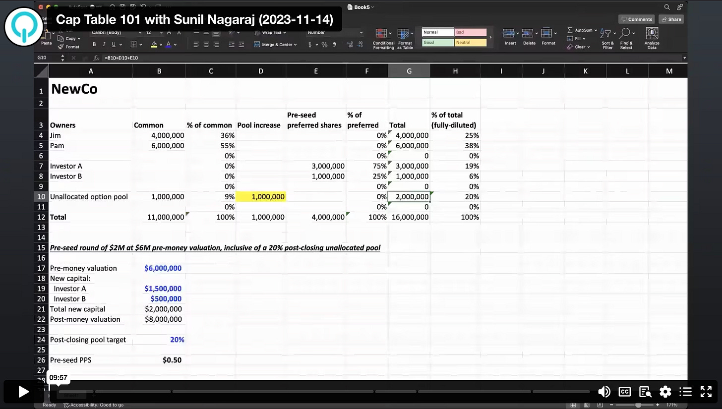 In this session, Sunil Nagaraj explains how startup cap tables work. He starts with a blank Excel sheet and builds up a new startup's capitalization table ("cap table"). It begins with 2 co-founders with an initial option pool, then we model in a pre-seed financing and increase the unallocated pool accordingly. Watch this 9-minute video now on Ubiquity University.